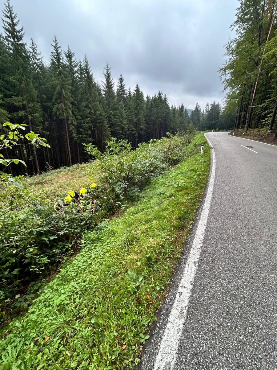 Ein Motorrad kam nach einem Sturz von der Fahrbahn ab und landete im Graben. Glücklicherweise gab es keine Verletzten und keine weiteren Beteiligten.