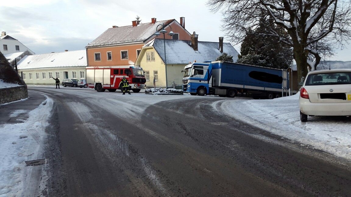 Auf Höhe Nussleiten 1 konnte ein LKW (trotz angelegter Schneeketten) seinen Weg nicht mehr aus eigener Kraft fortsetzen. Ein weiterer LKW stand bereits in Warteposition hinter dem ursprünglich stecken gebliebenen.