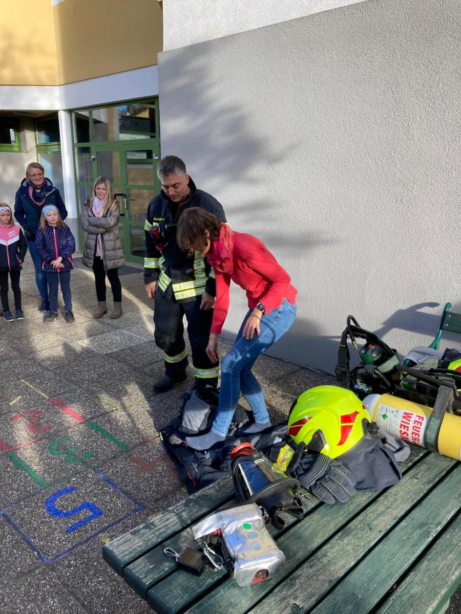 Nachdem alle Schüler und Lehrer sicher das Gebäude verlassen hatten, demonstrierten wir anhand einer Lehrerin die Ausrüstung und Funktionsweise eines Atemschutzgeräts.