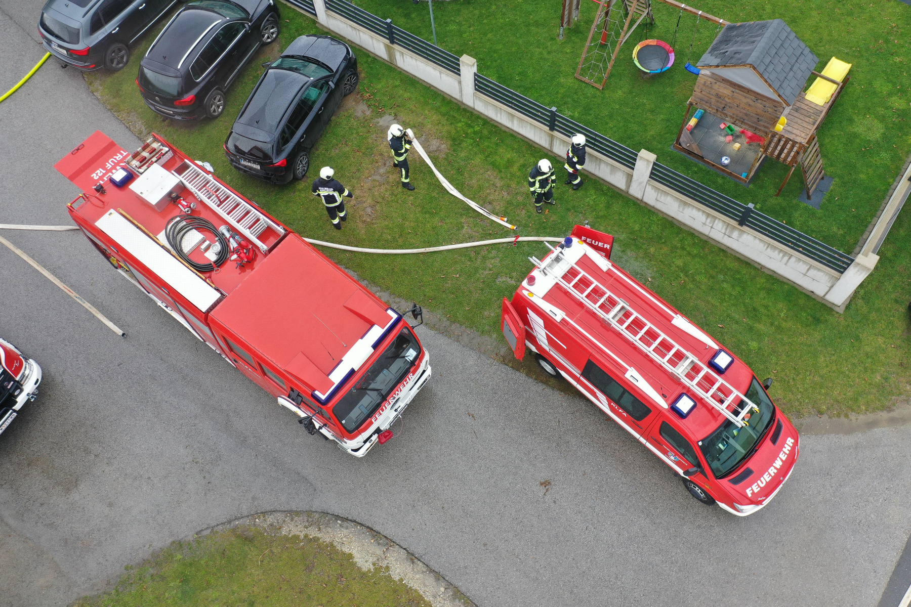 Um eine Ausbreitung des Brandes zu verhindern, wurde ein Brandschutz mit zwei B-Angriffsleitungen aufgebaut, um das angrenzende Wohnhaus zu schützen.