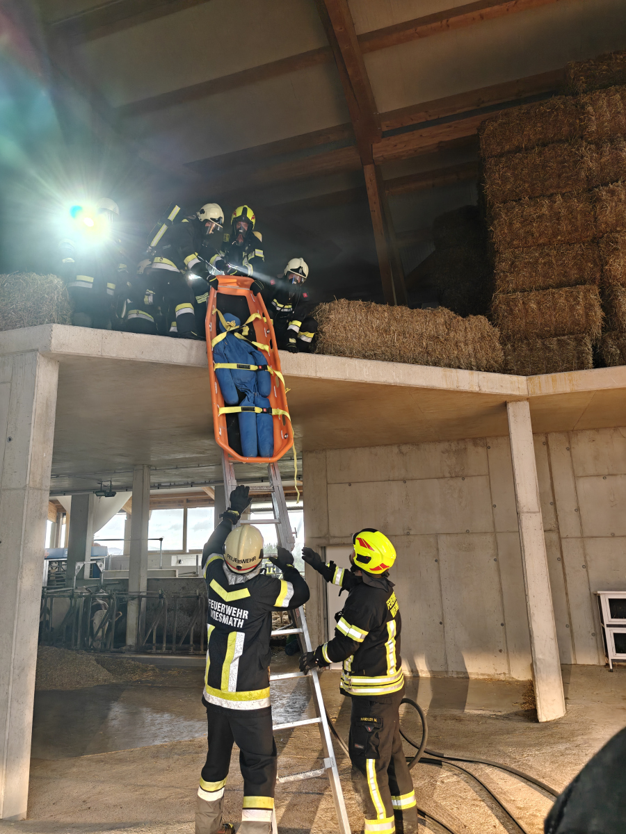 Nach dem Auffinden stellte sich heraus, dass beide Personen unter umgestürzten Heuballen eingeklemmt waren. Da es sich um einen Heudachboden ohne Stiegenhaus handelte, mussten die Personen mittels Leitern gerettet werden. Parallel dazu wurde der Brand unter Atemschutz bekämpft.