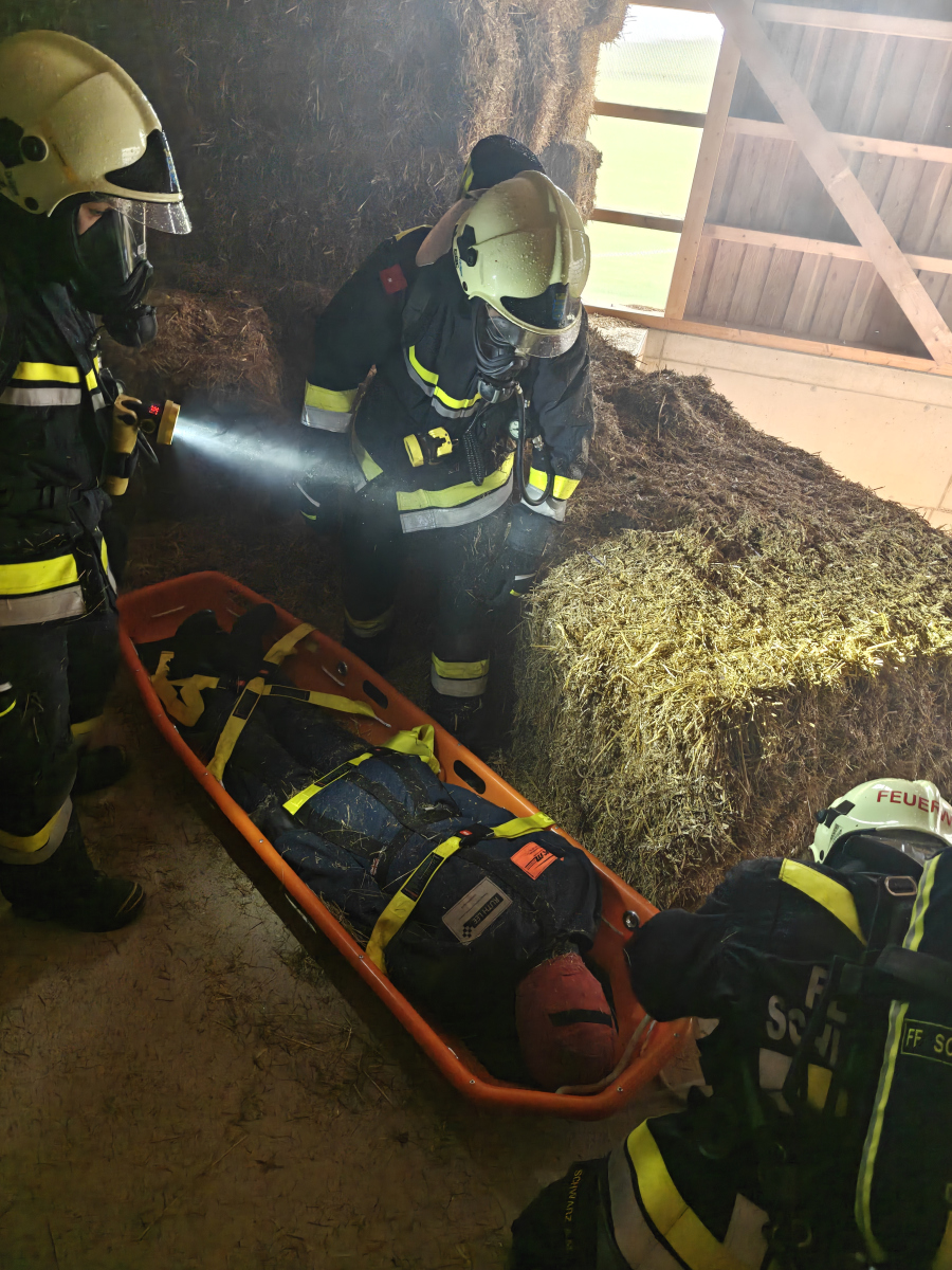 Nach dem Auffinden stellte sich heraus, dass beide Personen unter umgestürzten Heuballen eingeklemmt waren. Da es sich um einen Heudachboden ohne Stiegenhaus handelte, mussten die Personen mittels Leitern gerettet werden. Parallel dazu wurde der Brand unter Atemschutz bekämpft.
